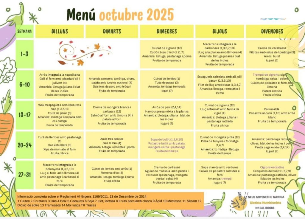 Menjador PROJECTE DE MENJADOR(clicau damunt per visulialitzar-lo) MENU OCTUBREMENÚ (clicau damunt)Podeu adquirir els tiquets de menjador a la secretaria del nostre centre de dilluns a divendres a les 8:00h Preus:– Tiquet senzill: 7,55€– Bloc de 10 tiquets: 68,5€