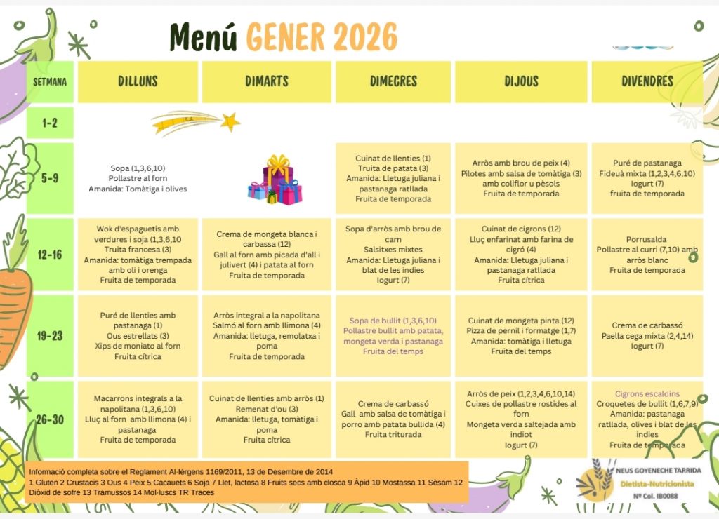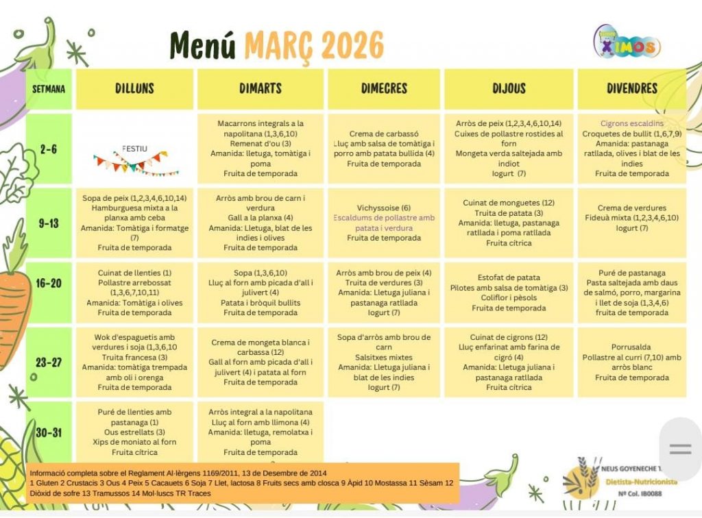 Menjador PROJECTE DE MENJADOR(clicau damunt per visulialitzar-lo) MENU GENERMENÚ (clicau damunt)Podeu adquirir els tiquets de menjador a la secretaria del nostre centre de dilluns a divendres a les 8:00h Preus:– Tiquet senzill: 7,55€– Bloc de 10 tiquets: 68,5€